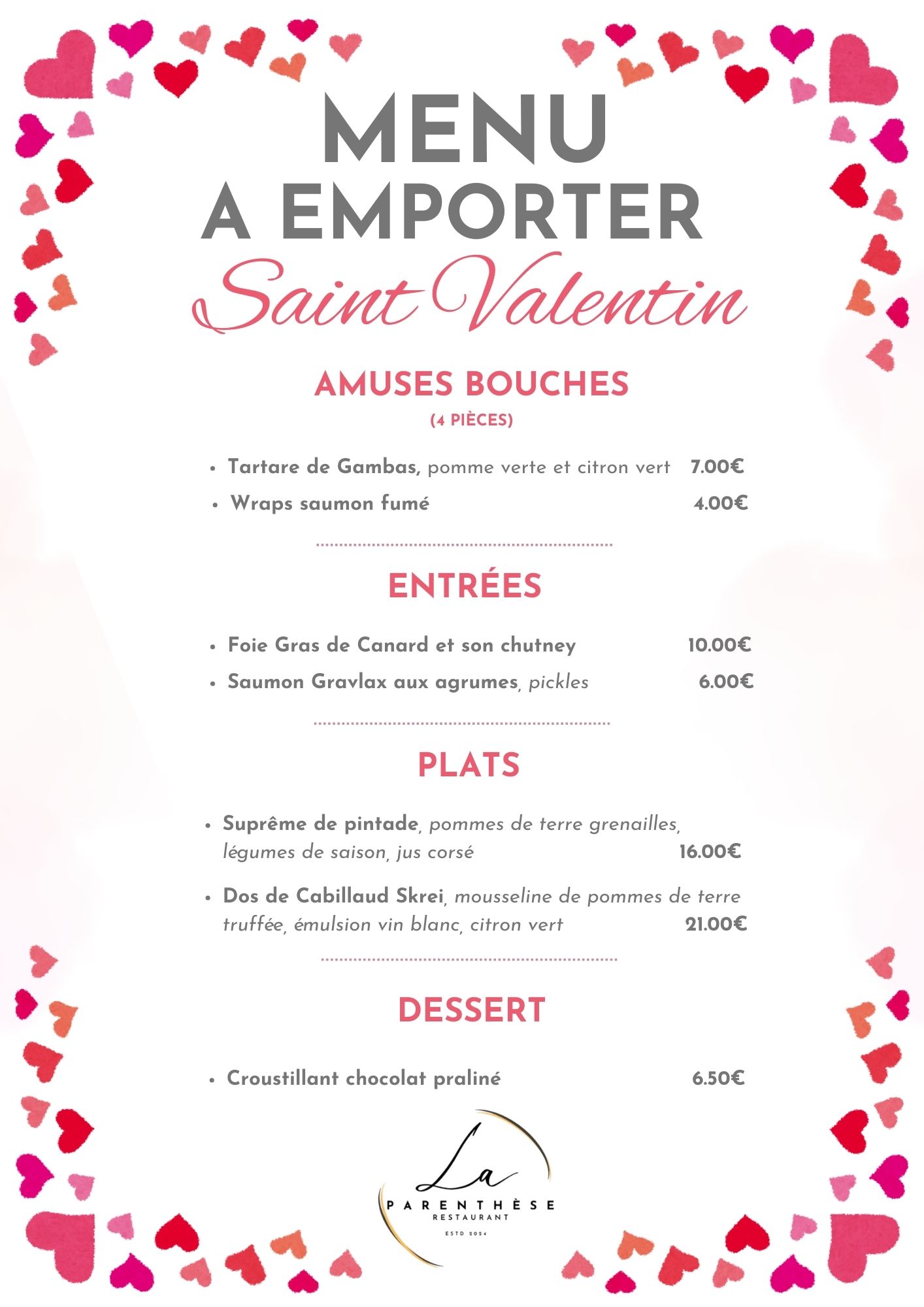 Pour le 14 février, La Parenthèse vous propose un menu spécial Saint-Valentin 🍽️, servi le midi et le soir.